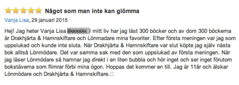 Jag upptäckte en ny läsarrecension på Bokus idag. Den här gången är det Vanja Lisa, 11 år, som har skrivit den och naturligtvis gjorde den mig jätteglad.